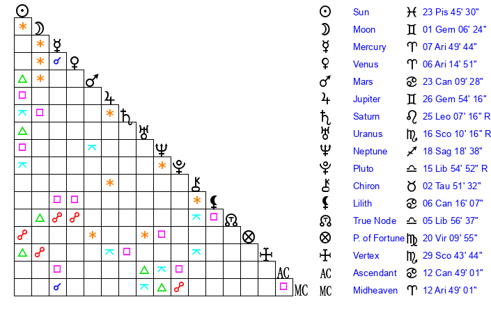 | Sun | 23 Pisces 46 | 24 Pisces 22 | 9 Taurus 59 |