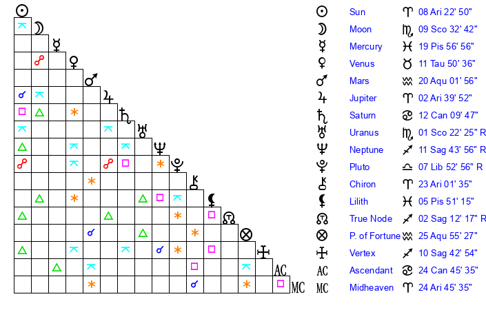 | Moon | 9 Scorpio 29 | 12 Aries 48 | 0 Virgo 48 |