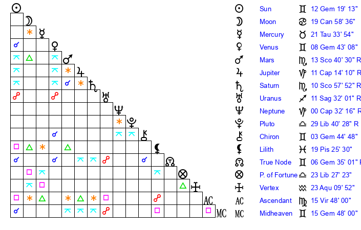 | Sun | 12 Gemini 19 | 12 Gemini 24 | 21 Cancer 27 |