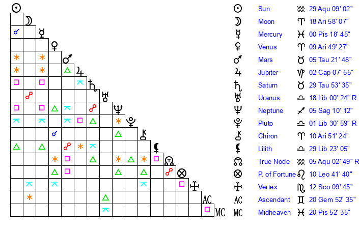 | Moon | 18 Aries 53 | 8 Scorpio 3 | 21 Pisces 40 |