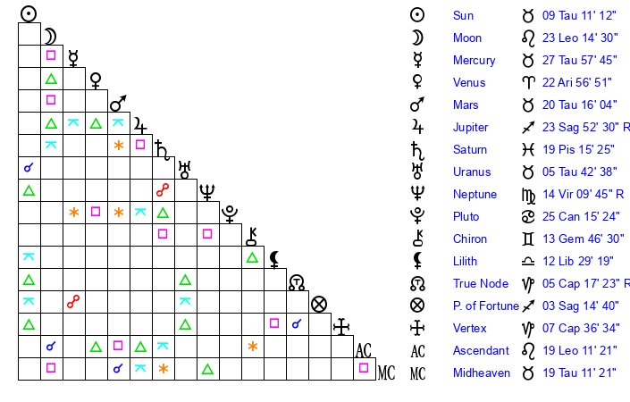 | Sun | 9 Taurus 11 | 9 Taurus 38 | 4 Leo 26 |
