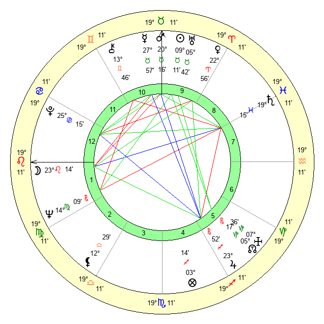 | Moon | 23 Leo 16 | 6 Gemini 33 | 17 Scorpio 27 |