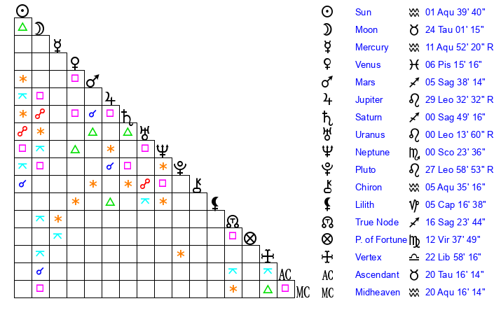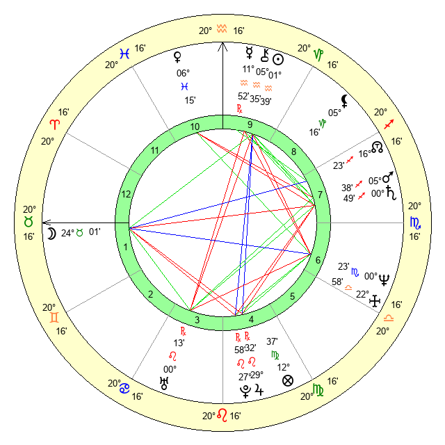 | Moon | 24 Taurus 12 | 12 Scorpio 2 | 12 Sagittarius 9 |