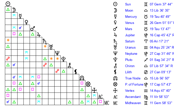 | Moon | 13 Libra 32 | 29 Gemini 42 | 4 Scorpio 59 |