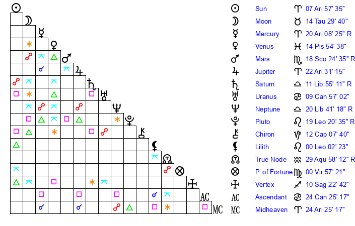 | Neptune | 20 Libra 41 | 29 Pisces 56 | 19 Libra 2 |