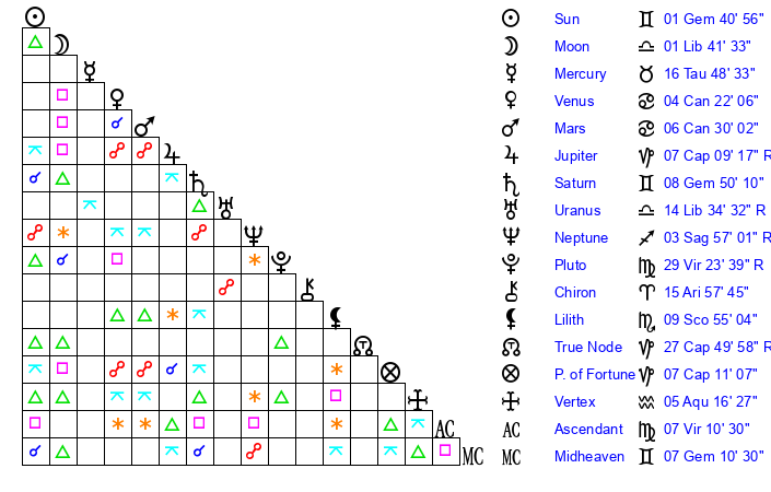 | Sun | 1 Gemini 40 | 1 Gemini 51 | 22 Cancer 19 |