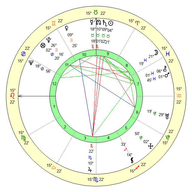 | Mars | 1 Pisces 46 | 3 Leo 13 | 20 Taurus 24 |