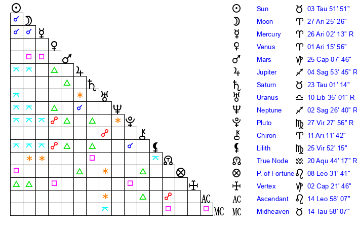 | Moon | 27 Aries 32 | 21 Pisces 16 | 17 Aries 41 |