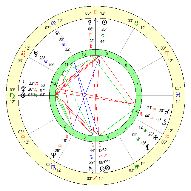 | Moon | 3 Virgo 11 | 23 Capricorn 20 | 3 Pisces 38 |