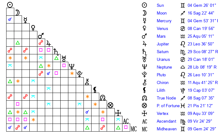 | Moon | 16 Sagittarius 14 | 14 Taurus 43 | 17 Gemini 28 |