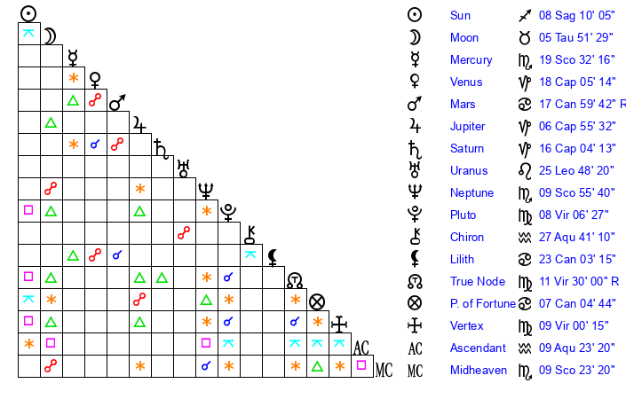 | Sun | 8 Sagittarius 10 | 8 Sagittarius 39 | 13 Aquarius 17 |