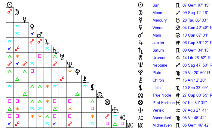 | Moon | 9 Sagittarius 15 | 24 Gemini 47 | 20 Scorpio 14 |