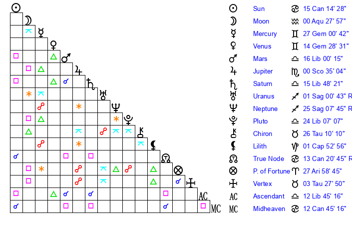 | Moon | 0 Aquarius 31 | 9 Sagittarius 30 | 4 Virgo 26 |