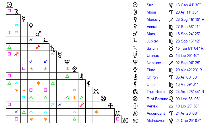 | Sun | 13 Capricorn 41 | 14 Capricorn 35 | 8 Pisces 27 |