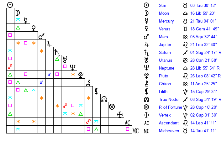 | Moon | 16 Libra 54 | 6 Pisces 54 | 13 Aries 43 |