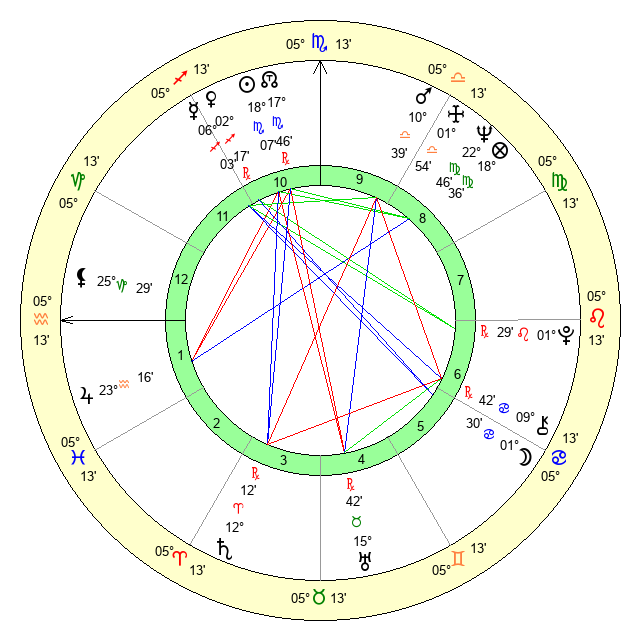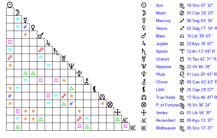 | Sun | 18 Scorpio 7 | 19 Scorpio 16 | 15 Aquarius 28 |
