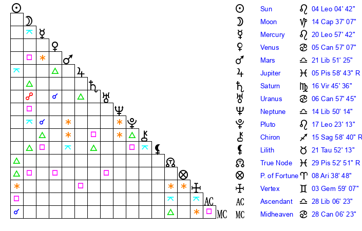 | Mercury | 20 Leo 58 | 12 Leo 6 | 1 Libra 43 |