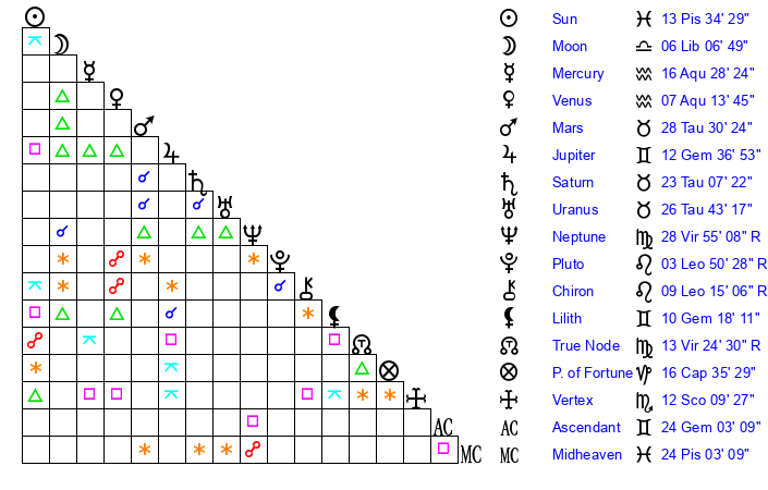 Sun | 13 Pisces 35 | 14 Pisces 27 | 4 Gemini 53 |