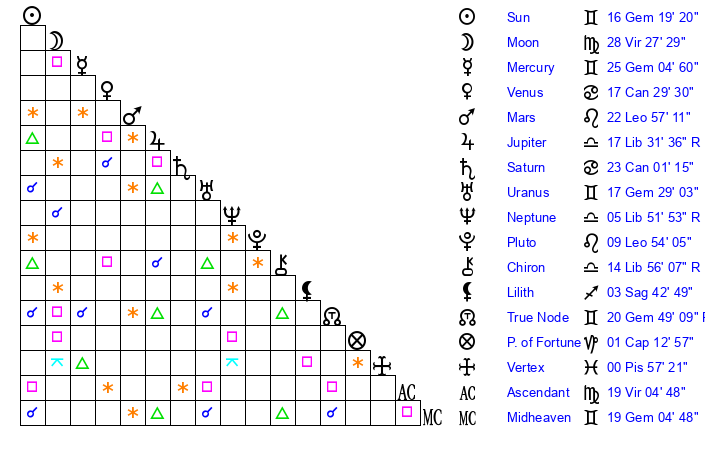 | Sun | 16 Gemini 20 | 17 Gemini 12 | 1 Virgo 52 |