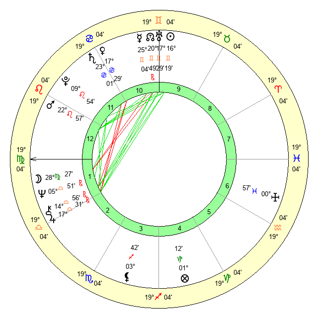 | Moon | 28 Virgo 36 | 7 Scorpio 9 | 16 Leo 37 |