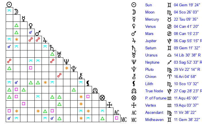 Sun | 4 Gemini 19 | 4 Gemini 30 | 24 Cancer 56 |