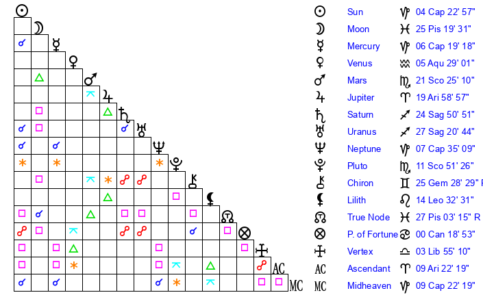 | Neptune | 7 Capricorn 34 | 27 Pisces 13 | 8 Capricorn 55 |