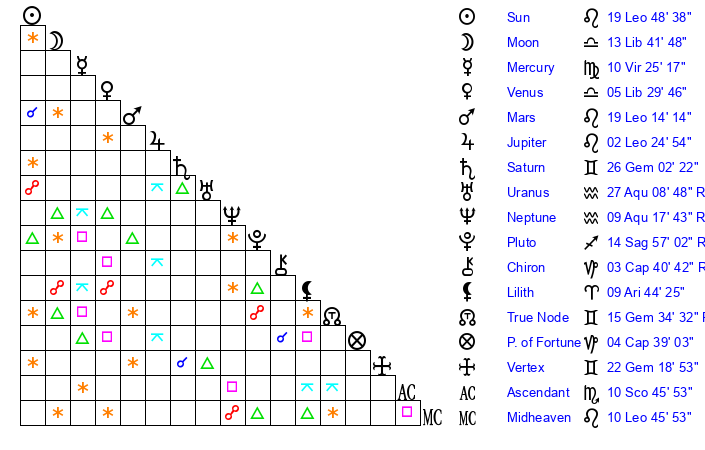 Sun | 19 Leo 49 | 20 Leo 14 | 11 Virgo 59 |