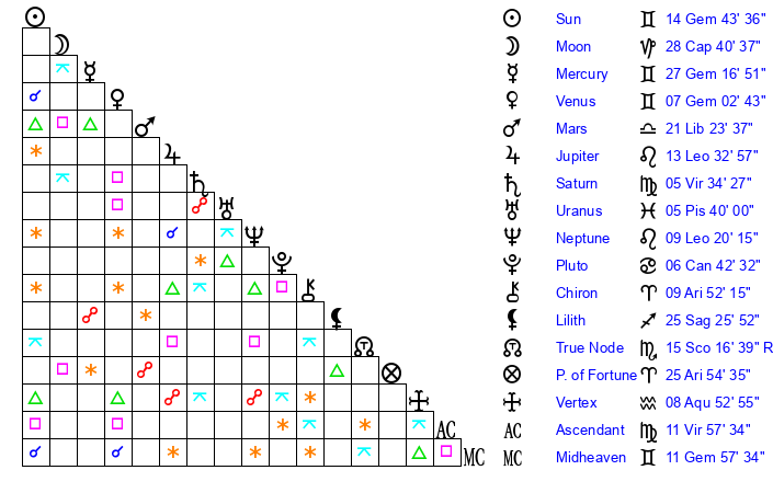 Venus | 7 Gemini 3 | 29 Aries 34 | 16 Libra 21 |