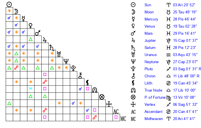 Moon | 25 Taurus 47 | 17 Capricorn 33 | 16 Gemini 3 |