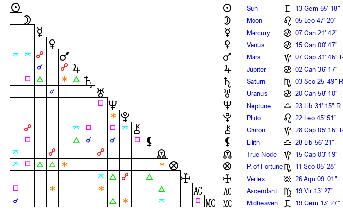 Sun | 13 Gemini 55 | 14 Gemini 43 | 21 Leo 45 |