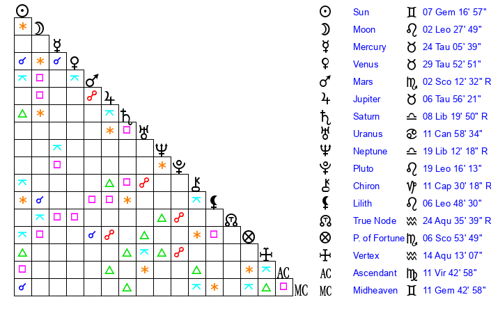 | Moon | 2 Leo 26 | 29 Gemini 42 | 11 Aries 0 |