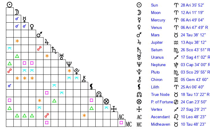 Sun | 28 Aries 36 | 28 Aries 54 | 7 Gemini 18 |