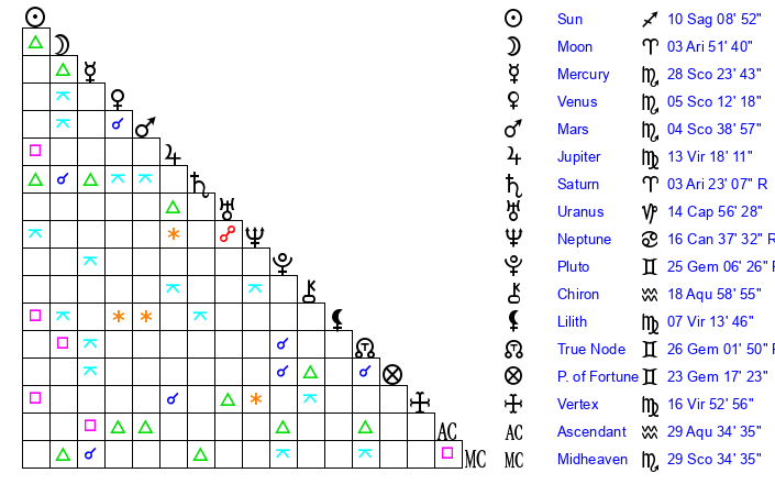| Venus | 5 Scorpio 13 | 2 Sagittarius 21 | 0 Aries 37 |