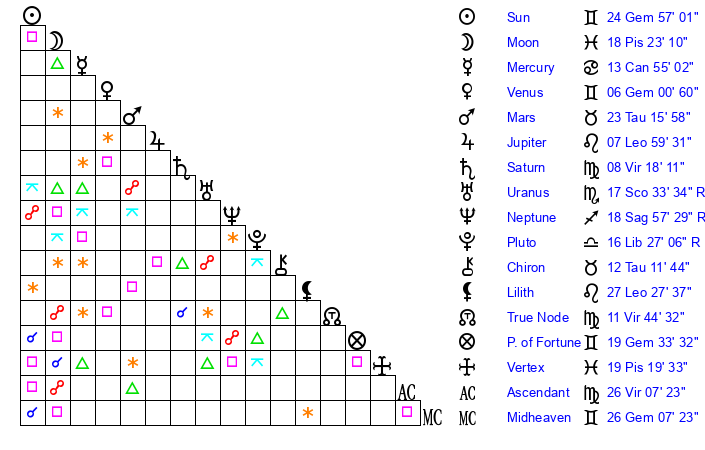 | Sun | 24 Gemini 57 | 25 Gemini 48 | 8 Leo 51 |