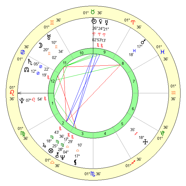 | Pluto | 7 Leo 54 | 3 Aquarius 44 | 9 Leo 3 |
