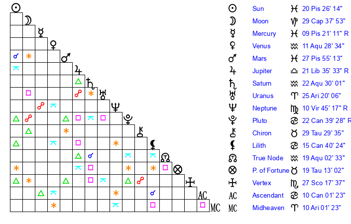 | Sun | 20 Pisces 26 | 21 Pisces 22 | 19 Gemini 6 |