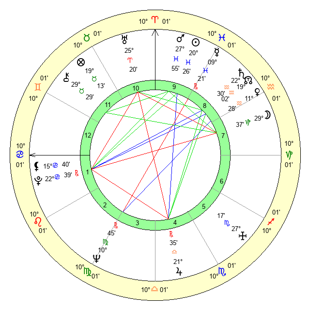 | Mars | 27 Pisces 56 | 18 Cancer 25 | 5 Gemini 41 |
