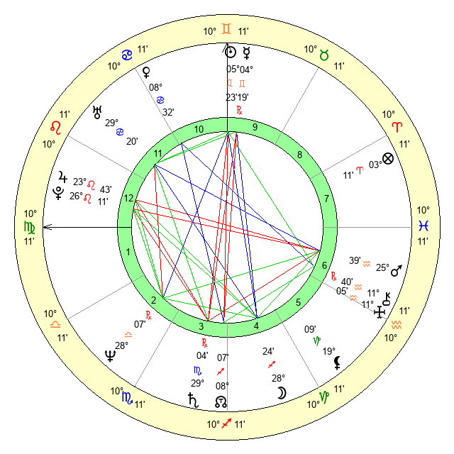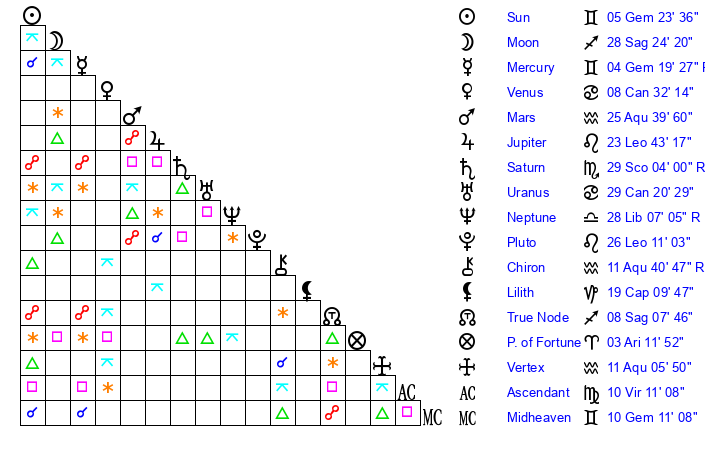 | Sun | 5 Gemini 23 | 5 Gemini 42 | 11 Leo 18 |