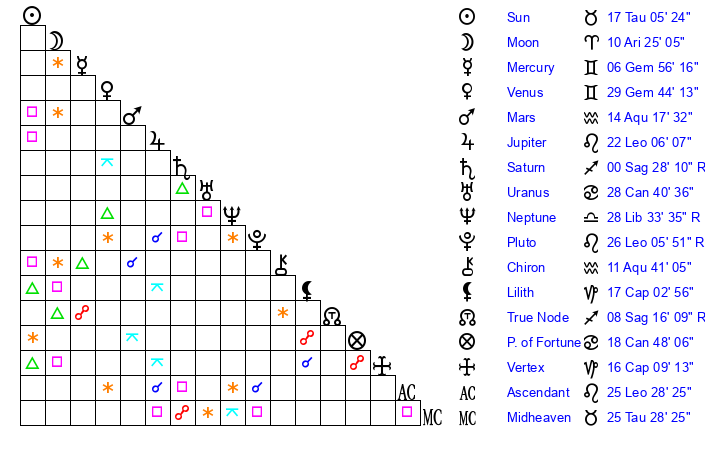 | Sun | 17 Taurus 5 | 17 Taurus 23 | 23 Cancer 8 |