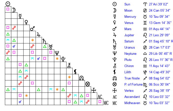 | Moon | 24 Cancer 12 | 19 Sagittarius 7 | 0 Aquarius 43 |