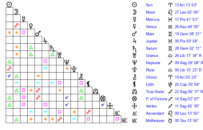 | Moon | 27 Leo 12 | 21 Gemini 58 | 6 Cancer 51 |