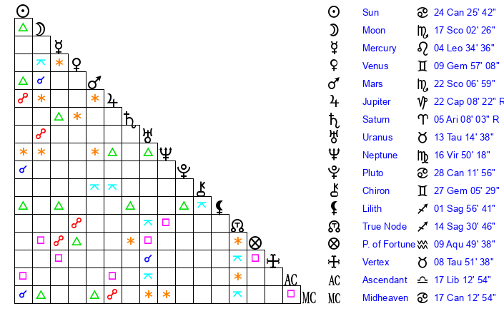 Sun | 24 Cancer 25 | 25 Cancer 8 | 19 Libra 41 |