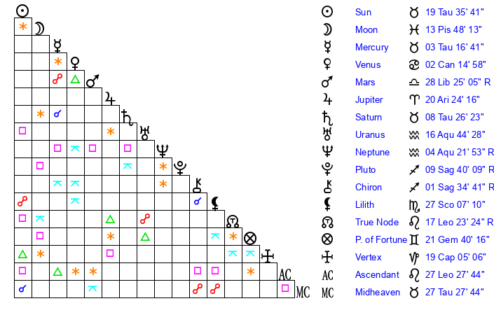 Moon | 13 Pisces 42 | 28 Libra 28 | 26 Aquarius 39 |
