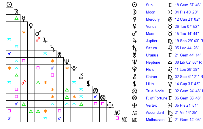 | Sun | 18 Gemini 58 | 20 Gemini 4 | 3 Virgo 34 |