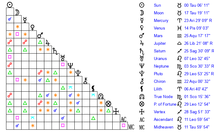 | Sun | 0 Taurus 6 | 0 Taurus 52 | 4 Cancer 34 |