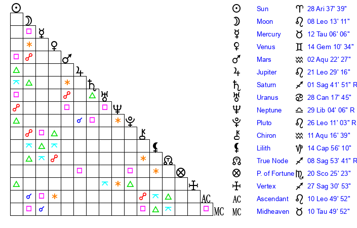 | Pluto | 26 Leo 10 | 3 Aquarius 45 | 26 Leo 40 |