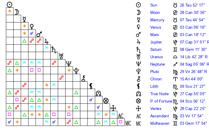 | Sun | 26 Taurus 52 | 27 Taurus 2 | 17 Cancer 33 |