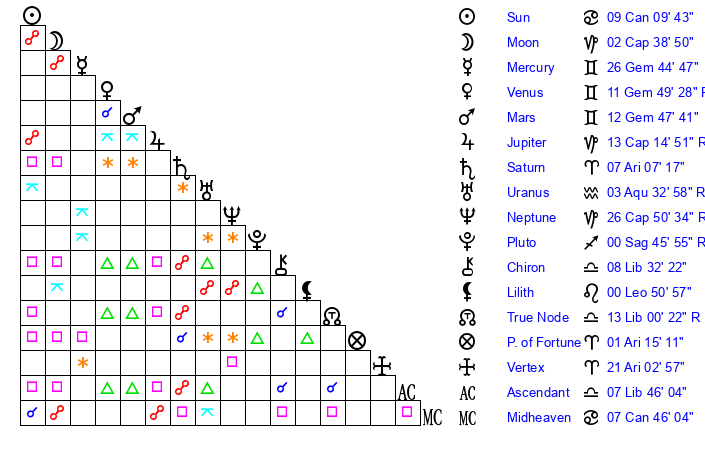 | Neptune | 26 Capricorn 50 | 2 Aries 10 | 26 Capricorn 3 |
