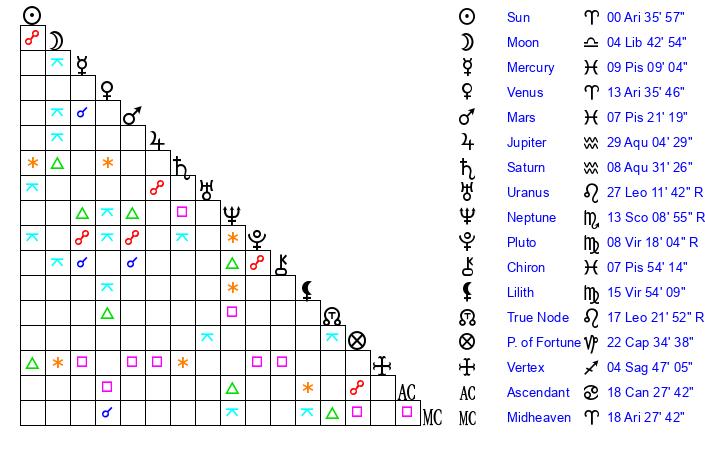 | Sun | 0 Aries 36 | 1 Aries 20 | 2 Gemini 4 |