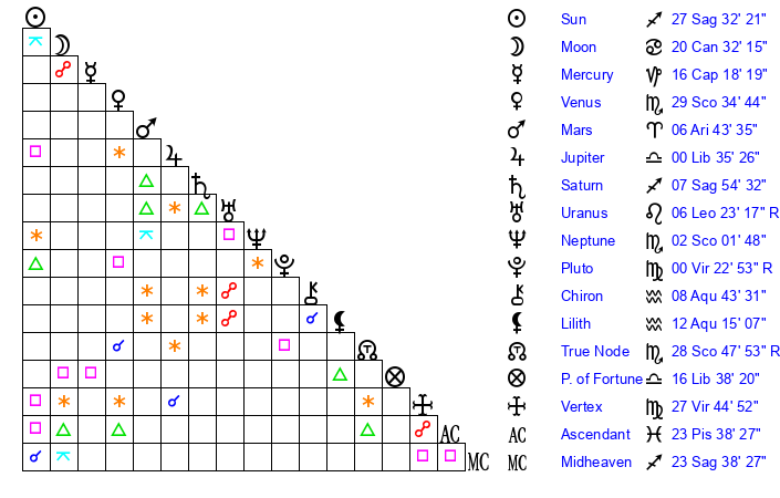 Pluto | 0 Virgo 22 | 0 Aquarius 41 | 29 Leo 0 |